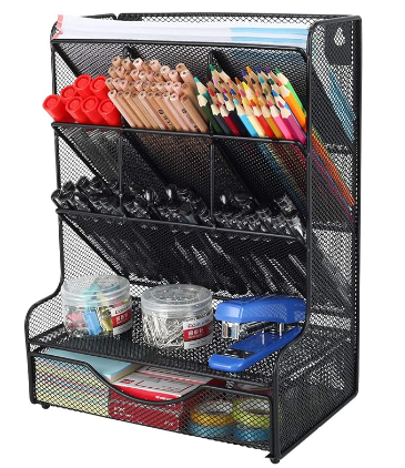 This metal mesh organizer from PAG includes several compartments and a drawer. It’s perfect for storing all your office essentials.