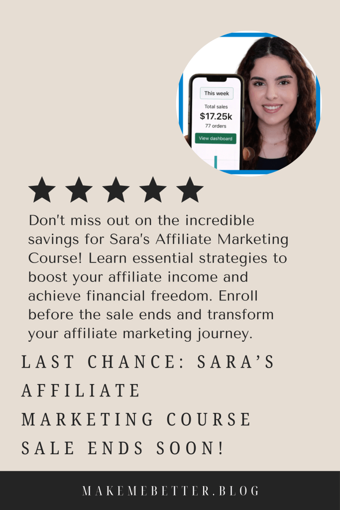 If you’ve been eyeing Sara’s Affiliate Marketing Course, now is the time to act—because the sale is closing very soon! This is your chance to dive into a comprehensive course designed to elevate your affiliate marketing skills and transform your financial future.